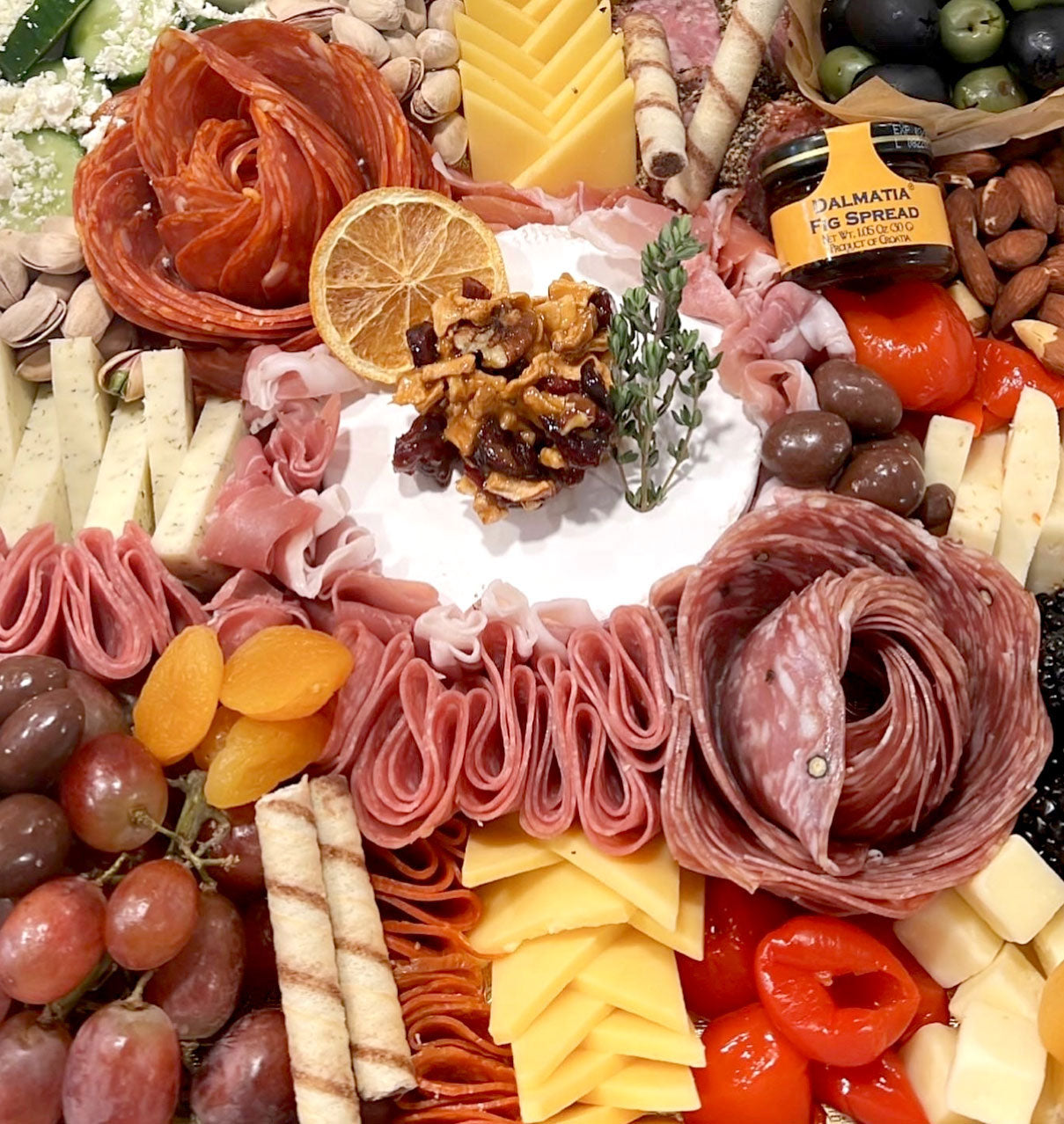 Savory boards include: a variety of sliced meats including prosciutto, salami, pepperoni & capicola, a variety of sliced cheeses, mixed seasonal fresh fruits, dried fruits, fresh vegetables, olives, gourmet mixed nuts, honey & jams, fresh herbs, and a variety of crackers and breads.